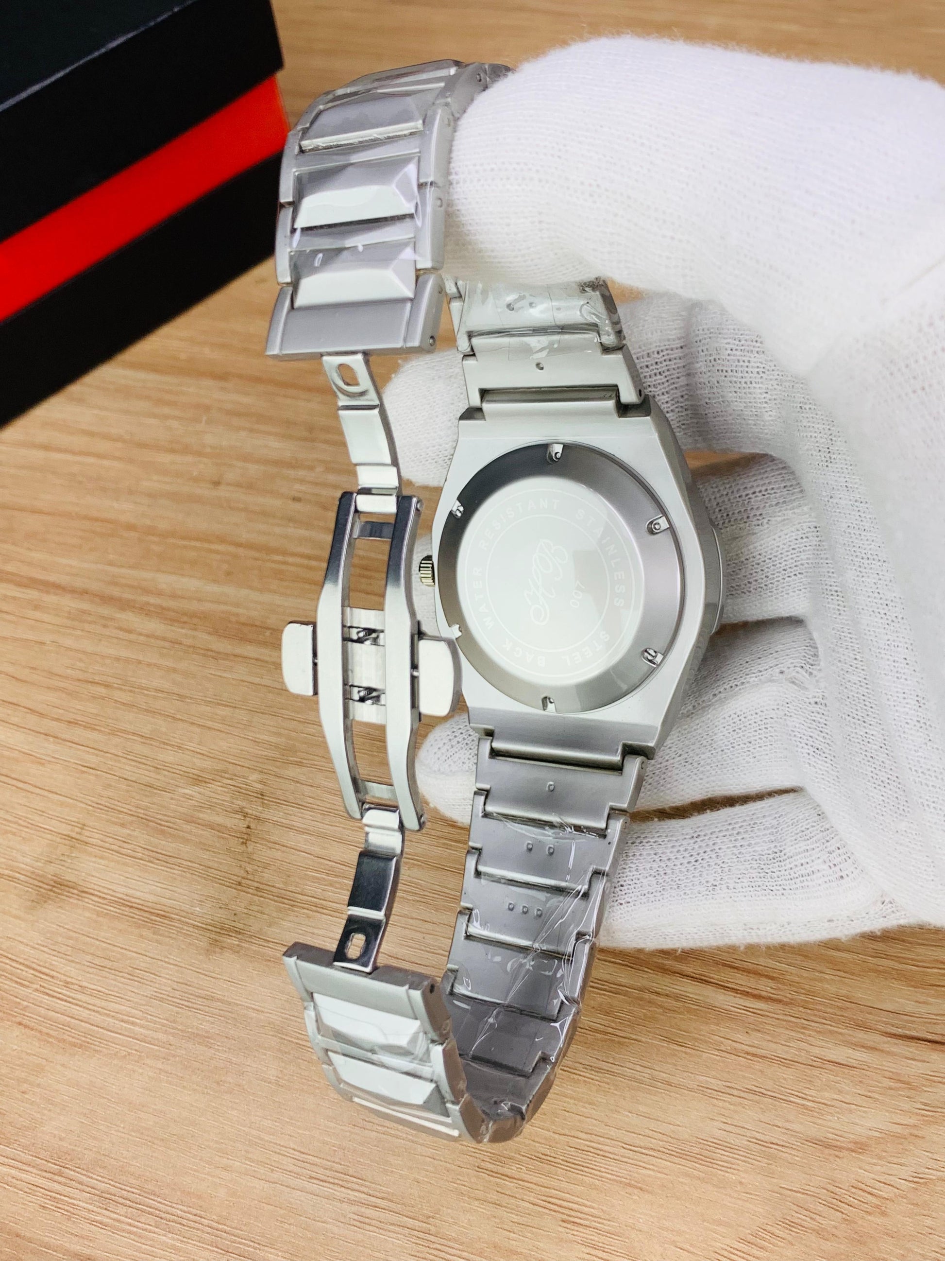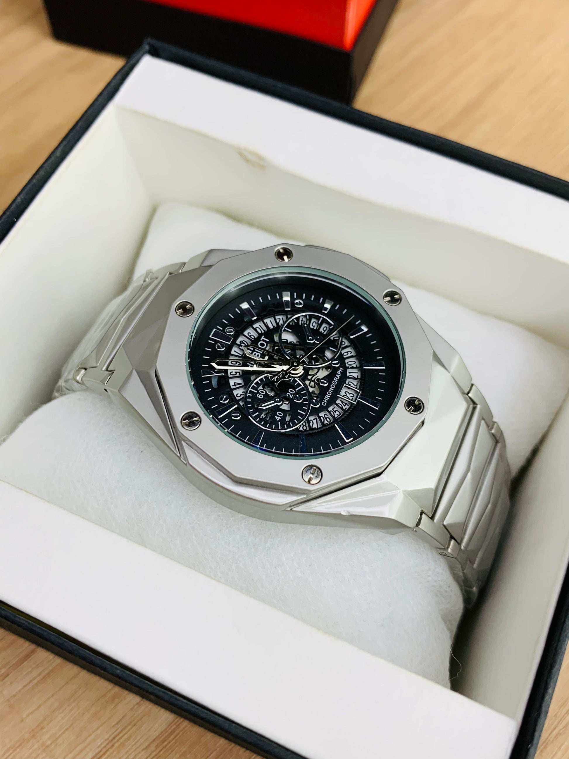 Modern Geometric Bezel Chronograph Watch with Stainless Steel Strap